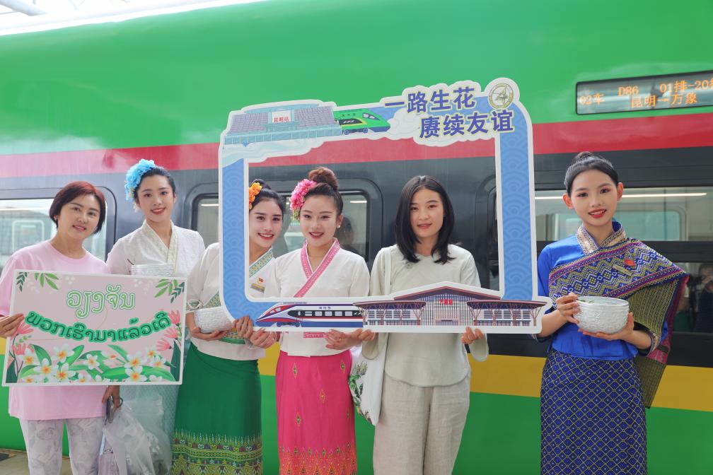 7月18日,在昆明站,乘坐昆明至万象D86次列车的乘客与乘务员合影。新华社发(杨紫轩摄)