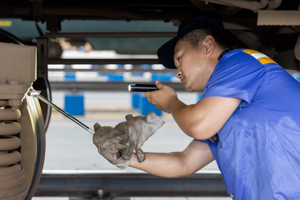 7月16日,上海机辆段客车检车员对车辆制动装置进行检查。新华社记者 王翔 摄
