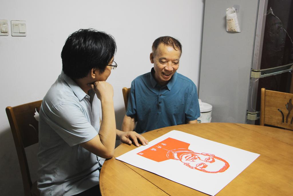 彭许平(左)在给曾武其(右)介绍革命烈士曾开盛剪纸作品。新华社记者陈浚武 摄