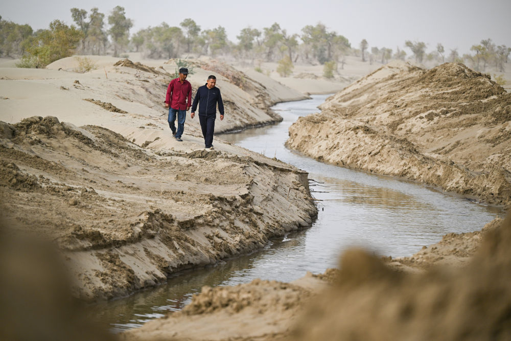 2025年9月19日,新疆巴音郭楞蒙古自治州尉犁县国有林管理局护林员艾力·尼亚孜(右)和同事沿着人工开挖的引洪补水生态渠巡视。