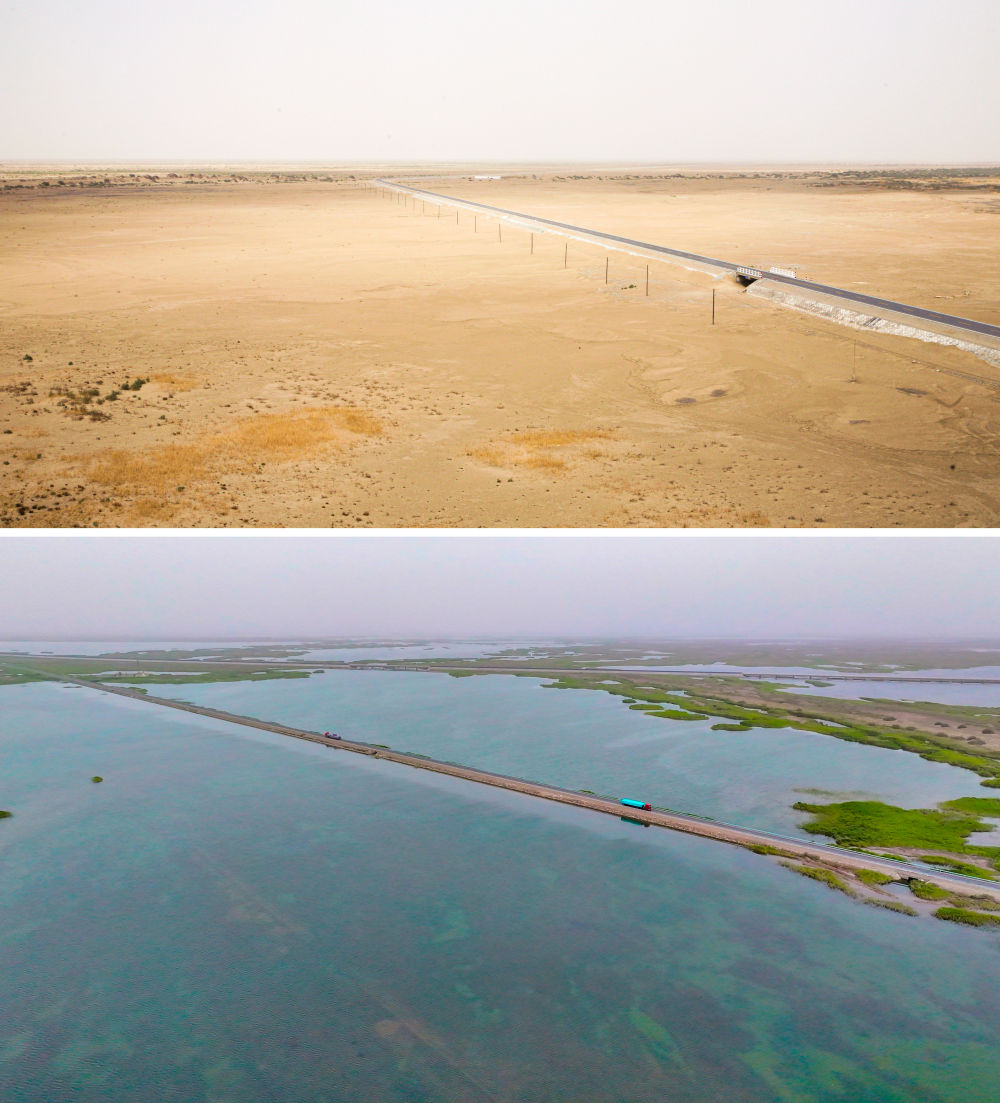 拼版照片:上图为2008年7月拍摄的干涸的台特玛湖(资料照片,塔里木河流域管理局供图);下图为2025年7月拍摄的台特玛湖(无人机照片,苏波摄)。新华社发