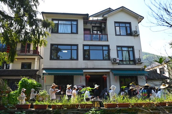 2025年8月5日,在浙江省杭州市余杭区径山村,游客经过一家低碳民宿。新华社记者 毛竹 摄