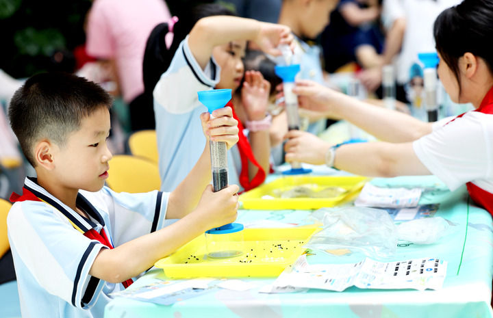 2025年7月5日,小朋友在中国杭州低碳科技馆进行科学实验体验。新华社发(周方玲摄)