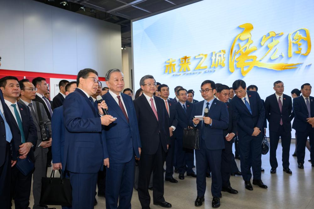4月14日上午,越共中央总书记、国家主席苏林开始对中国进行为期四天的国事访问。抵达北京后,他随即乘高铁前往雄安新区参访。这是苏林在雄安新区启动区综合服务中心参访。 新华社记者 金良快 摄
