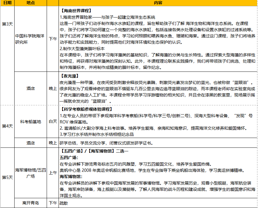 在科学家的带领下,登上海洋科学考察船,深入了解大型海洋科考设备,体验科学家海上科考环境,了解最前沿的海洋探测技术;与科学家面对面交流,走进海洋的微观世界;走进全球唯一一个以海藻为主题的沉浸式体验馆,动手制作海藻手模,感受海藻的神奇魅力;走进亚洲馆藏量最大的海洋生物标本馆,近距离观察各种珍稀海洋生物;夜间追寻“蓝眼泪”踪迹,全面了解夜光藻及其背后的生物、生态学知识。