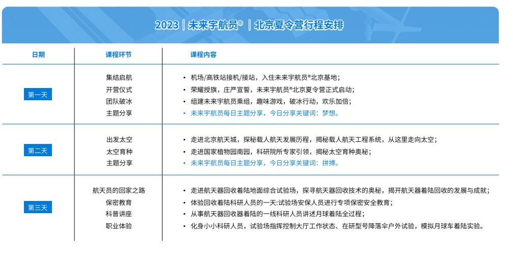 本次研学活动开启多个可供选择的项目,涵盖探秘自然、天文科普、未来宇航员、海洋科学、前沿科技和草原动物生态研究等领域。活动地点囊括陕西、河北、北京、山东和内蒙古等省区市,为方便同学们安排时间设计了9个时间范围,覆盖7-18岁不同年龄段。