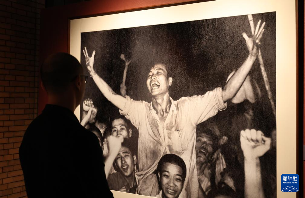9月1日,参观者在艺术展上展出的抗战主题摄影作品前驻足观看。