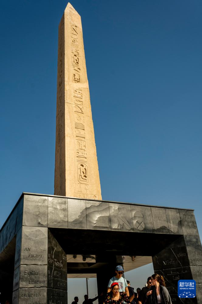 12月20日,游客在埃及吉萨的大埃及博物馆观赏法老拉美西斯二世的方尖碑。