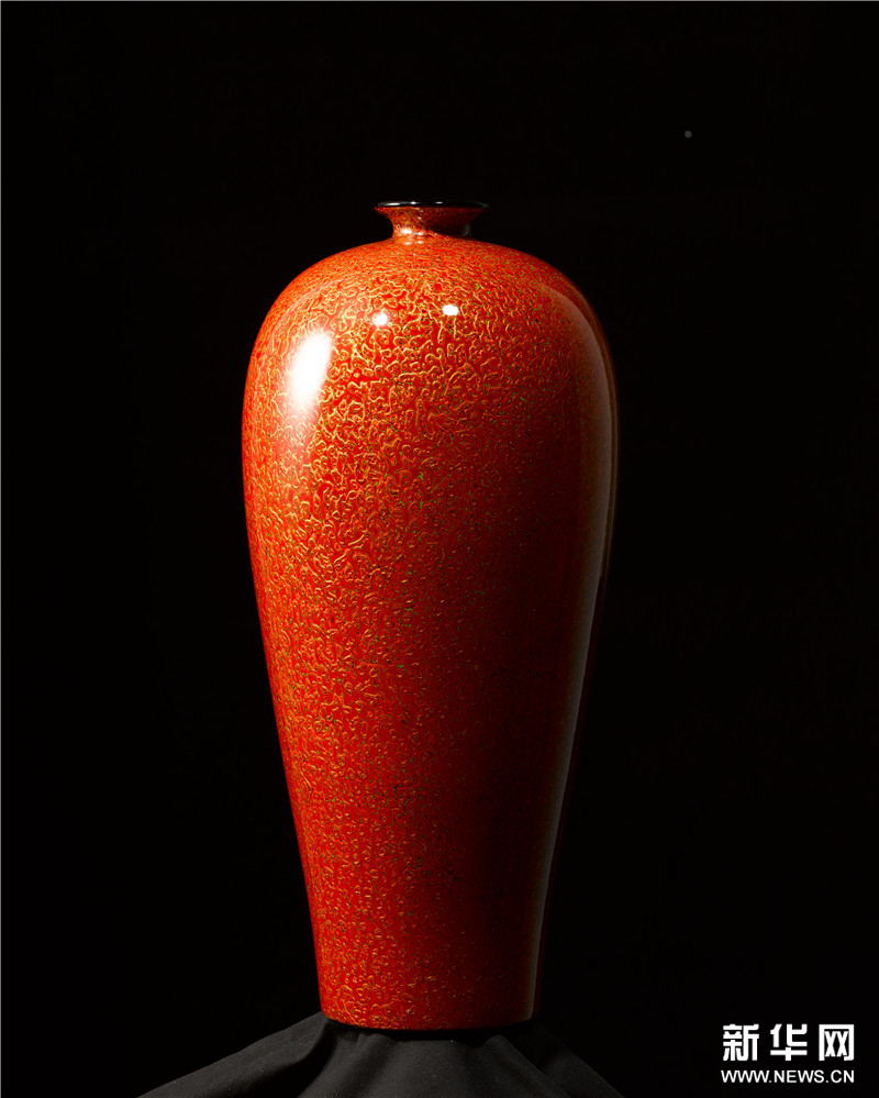 甘而可 红金斑犀皮漆梅瓶 大漆、夏布、古瓦灰、金箔、矿物质颜料18×18×23.6cm 2023年