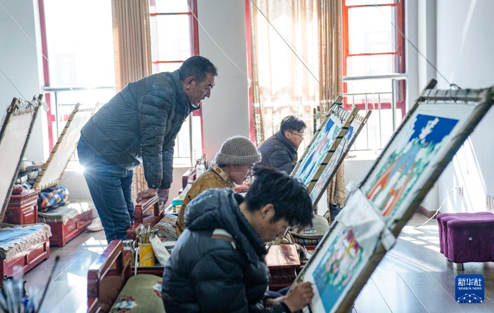 2月10日,学徒在西藏唐卡画院的教室里画唐卡。