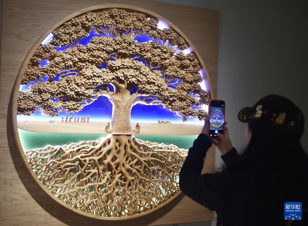 3月23日,参观者在中国美术馆拍摄展出的木雕展品《生万物》。