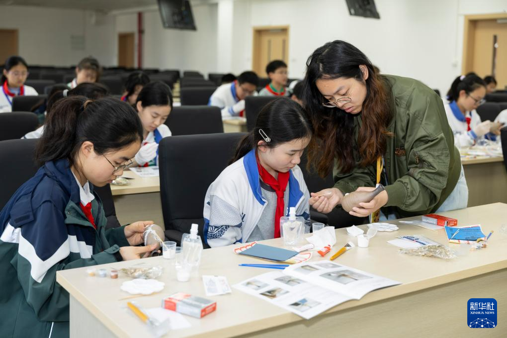4月10日,学生参加艺术工作坊体验破损陶瓶的修复。