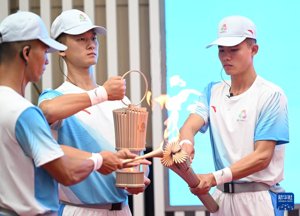 11月2日,火种护卫在融火仪式上用引火棒引燃火炬。