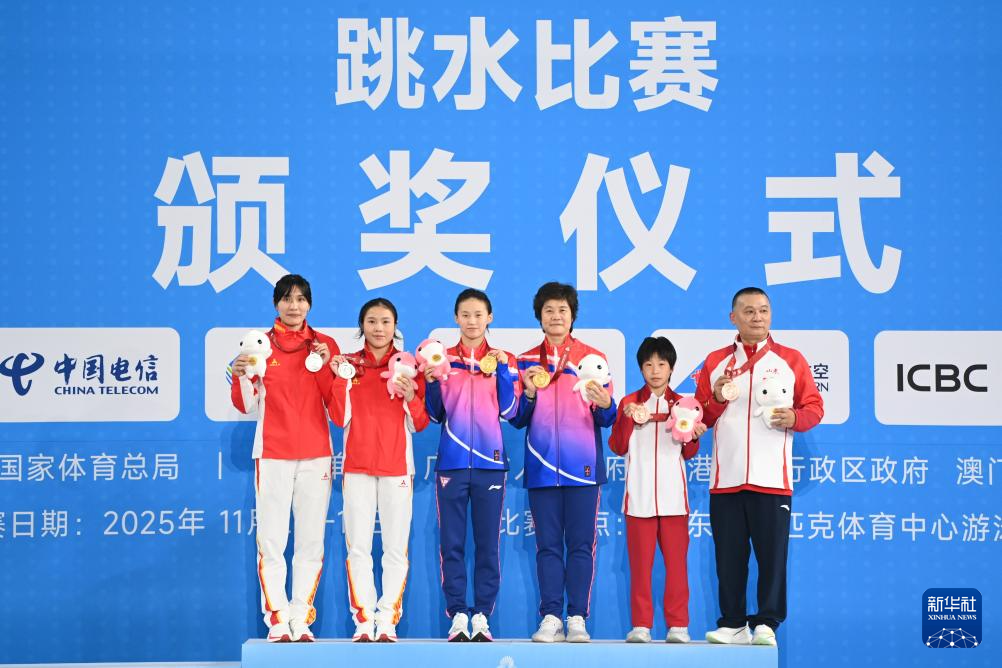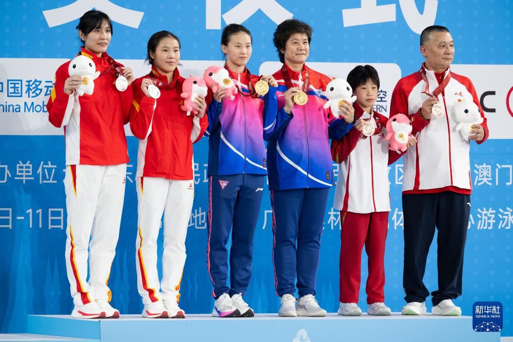 11月10日,获得冠军的上海队选手陈芋汐(左三)、获得亚军的四川队选手卢为(左二)、获得季军的山东队选手刘紫涵(右二)在颁奖仪式上与教练合影。