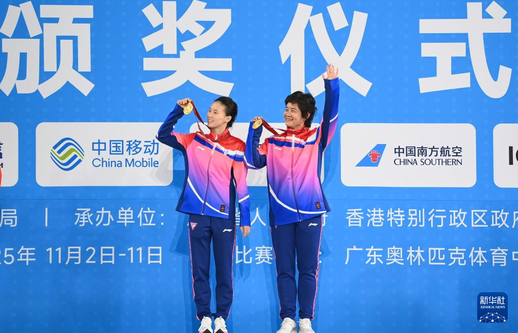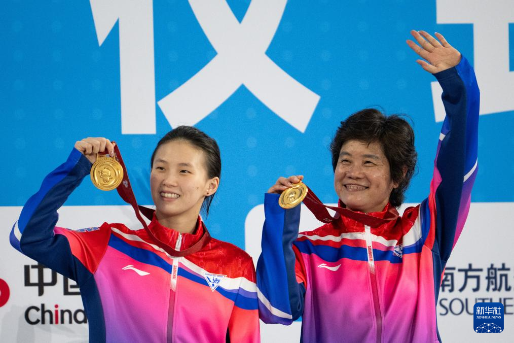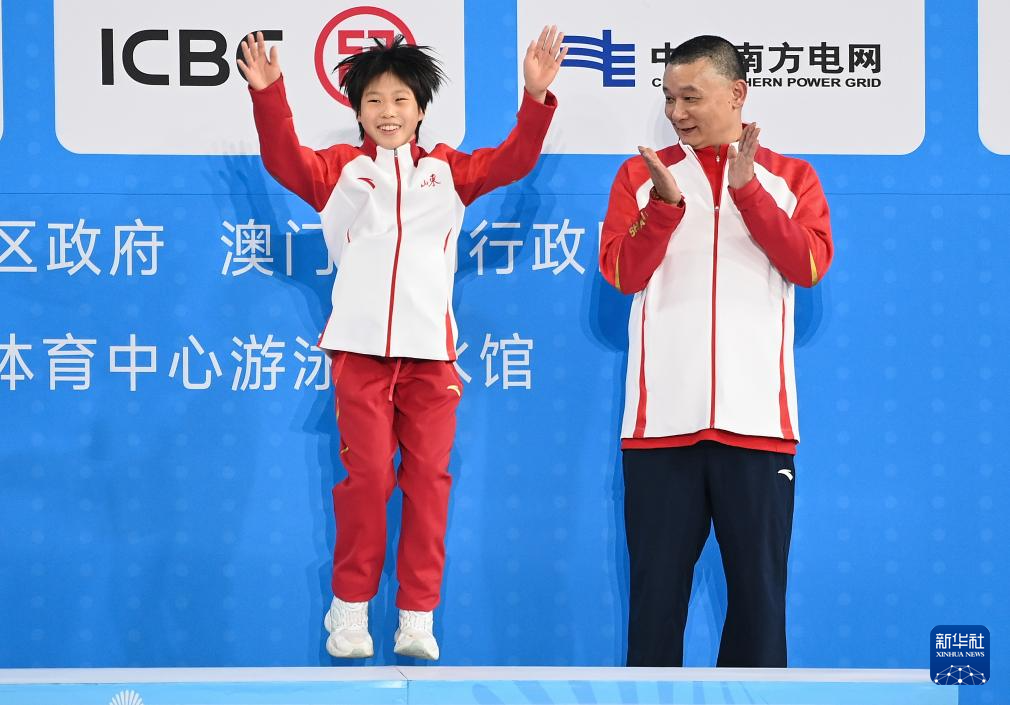 11月10日,获得冠军的上海队选手陈芋汐(左)和教练在颁奖仪式上庆祝。