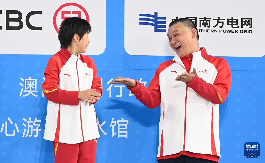 11月10日,获得冠军的上海队选手陈芋汐(右)和教练在赛后庆祝。
