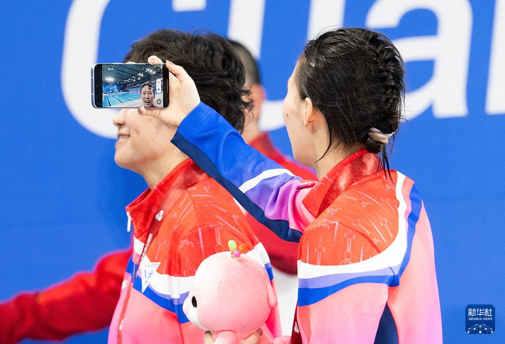 11月10日,获得冠军的上海队选手陈芋汐(右)在赛后自拍。