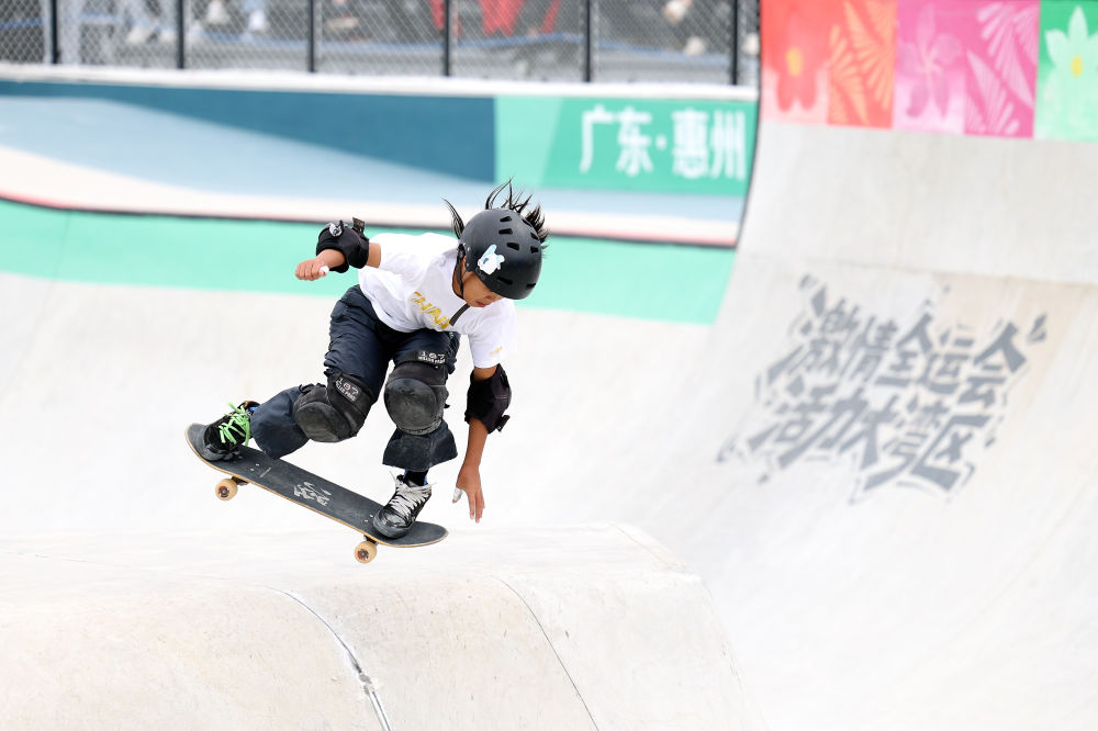 滑板赛场更是少年天下。当天决出的4枚金牌中的3枚被青少年选手获得,摘得奖牌的12人中有9人尚未成年。当天年龄最小的冠军产生在女子碗池,13岁的广东选手邹明珂以0.32分的微弱优势反超12岁的山东选手孟令妍,拿下金牌。
