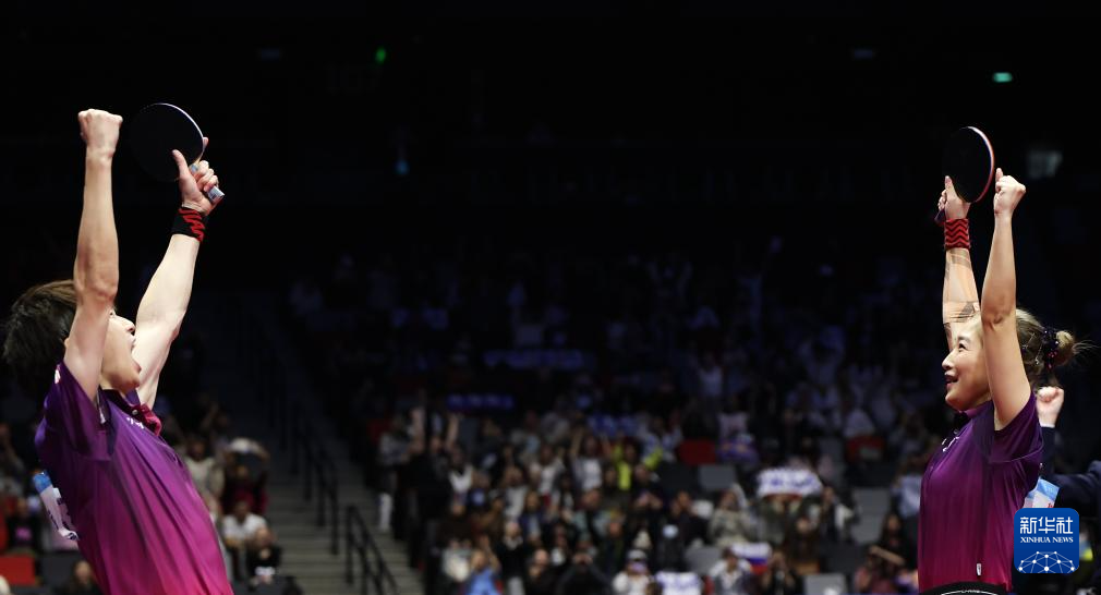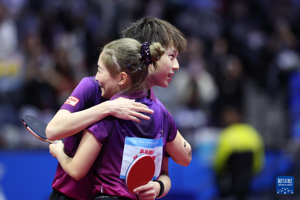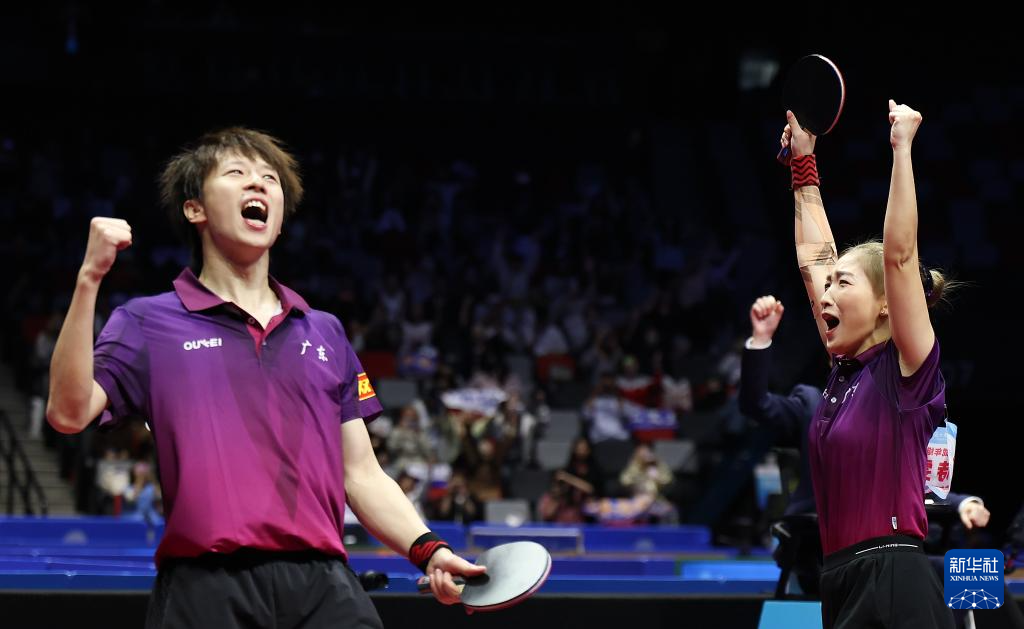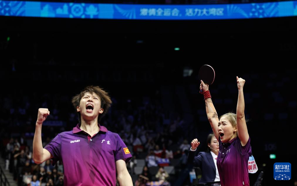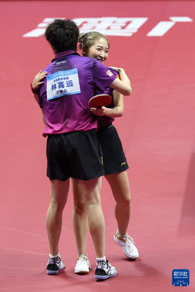11月14日,广东队组合林高远(右)/刘诗雯在比赛后庆祝夺冠。