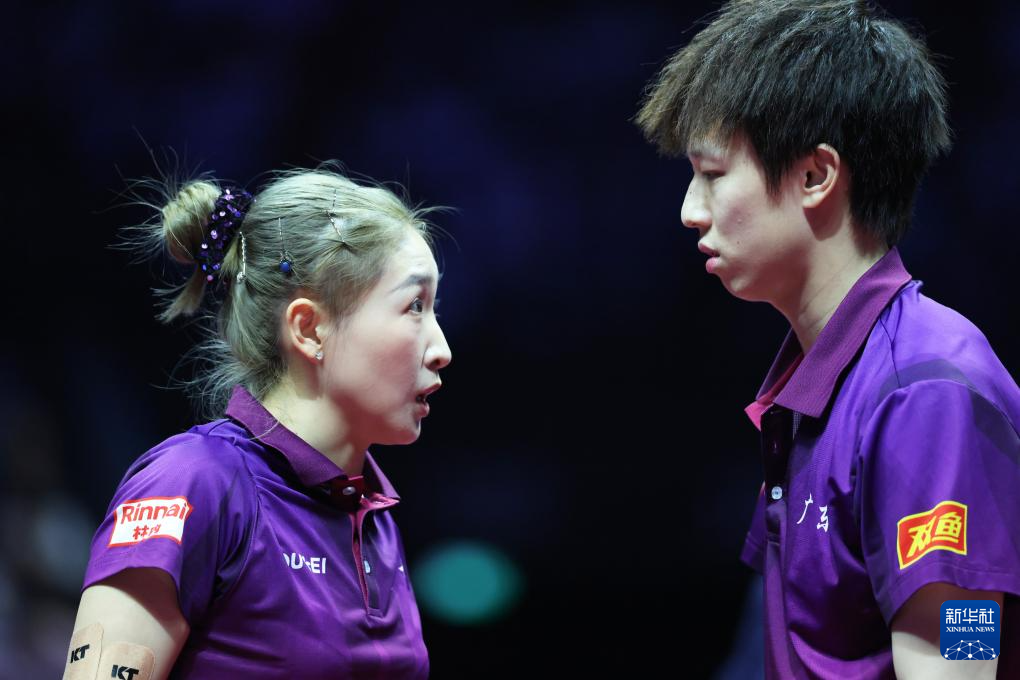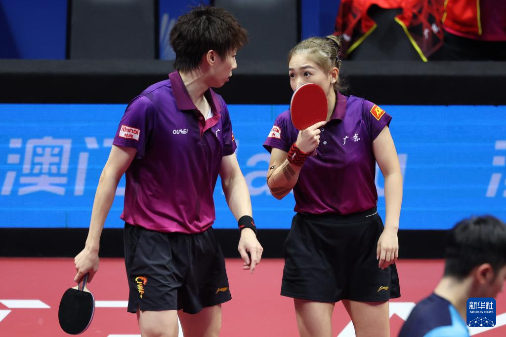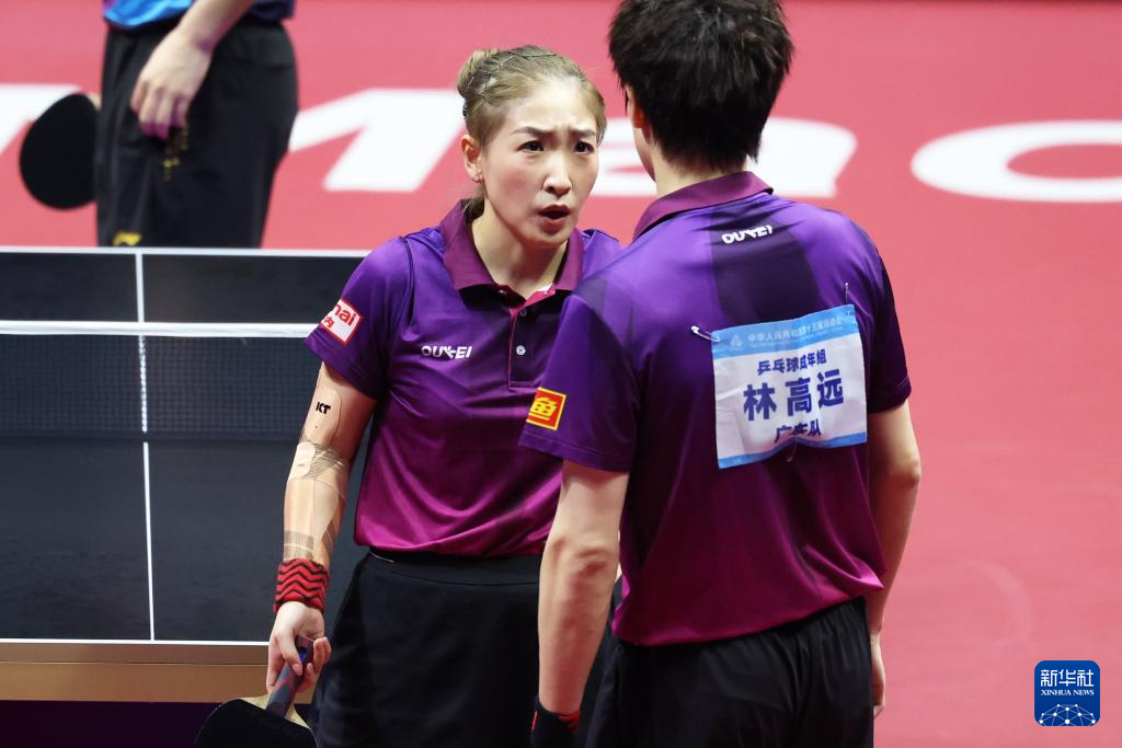 11月14日,广东队组合林高远/刘诗雯(右)在比赛中交流。