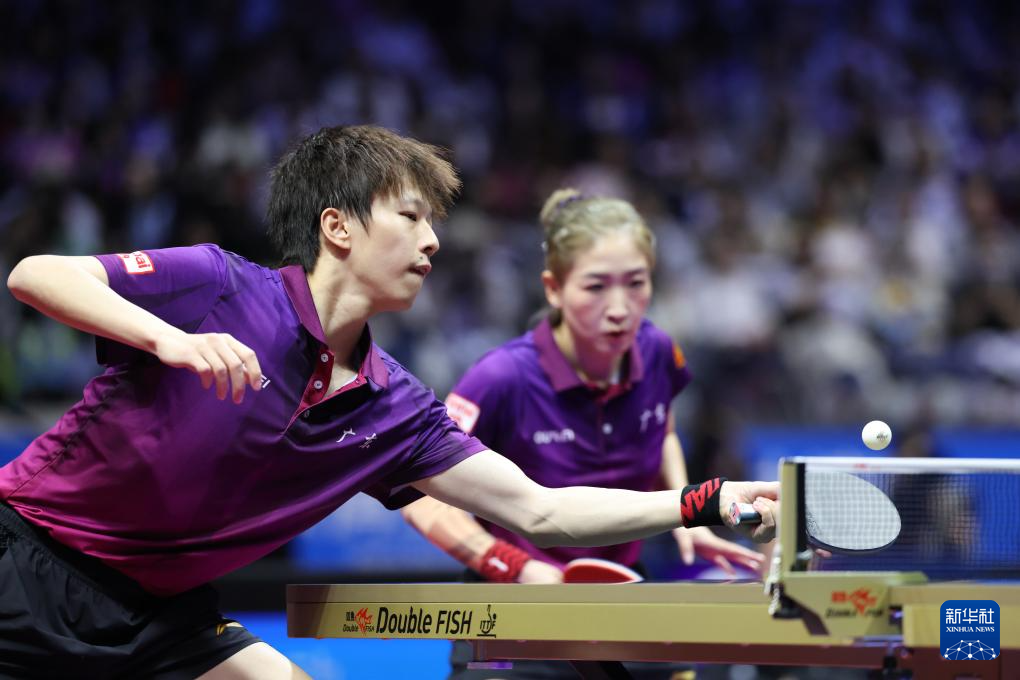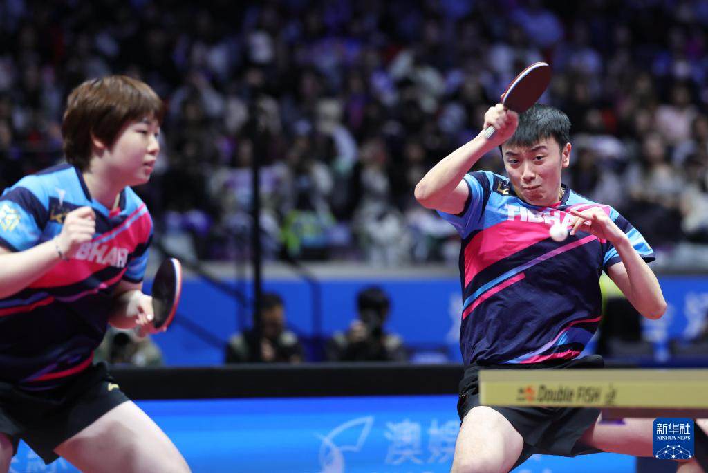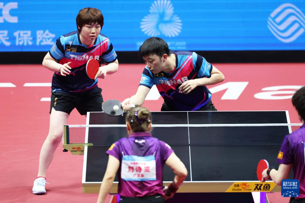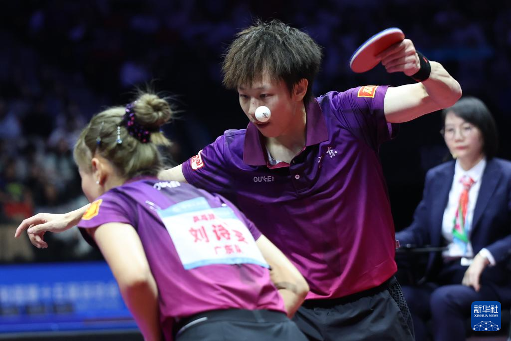 11月14日,广东队组合林高远(右)/刘诗雯在比赛中回球。