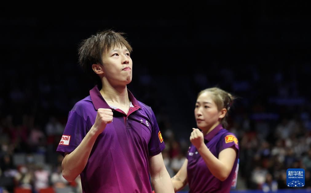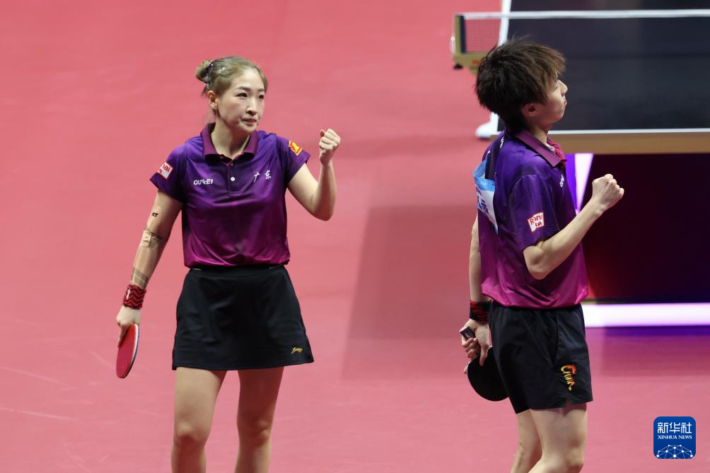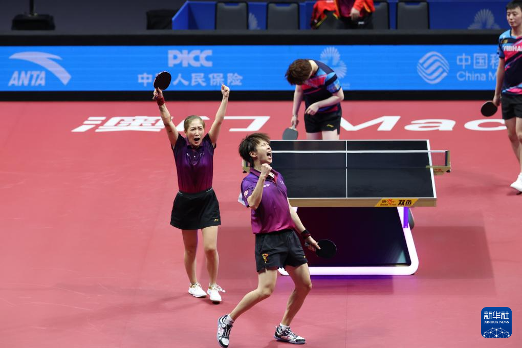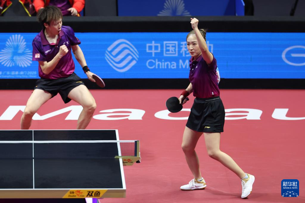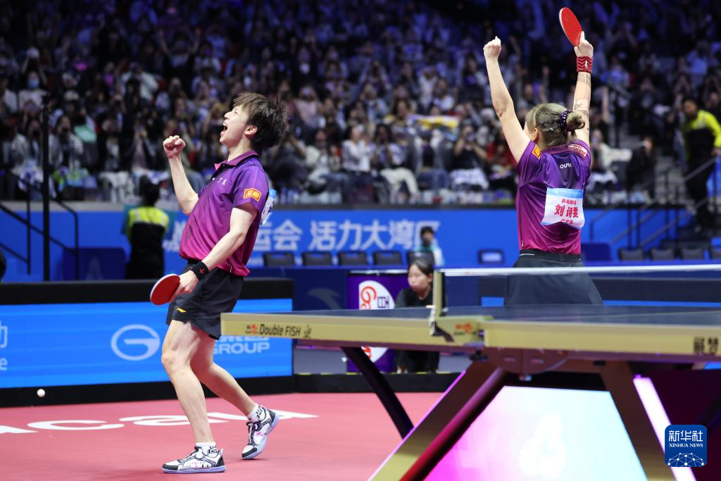 11月14日,广东队组合林高远(右)/刘诗雯在比赛中庆祝得分。