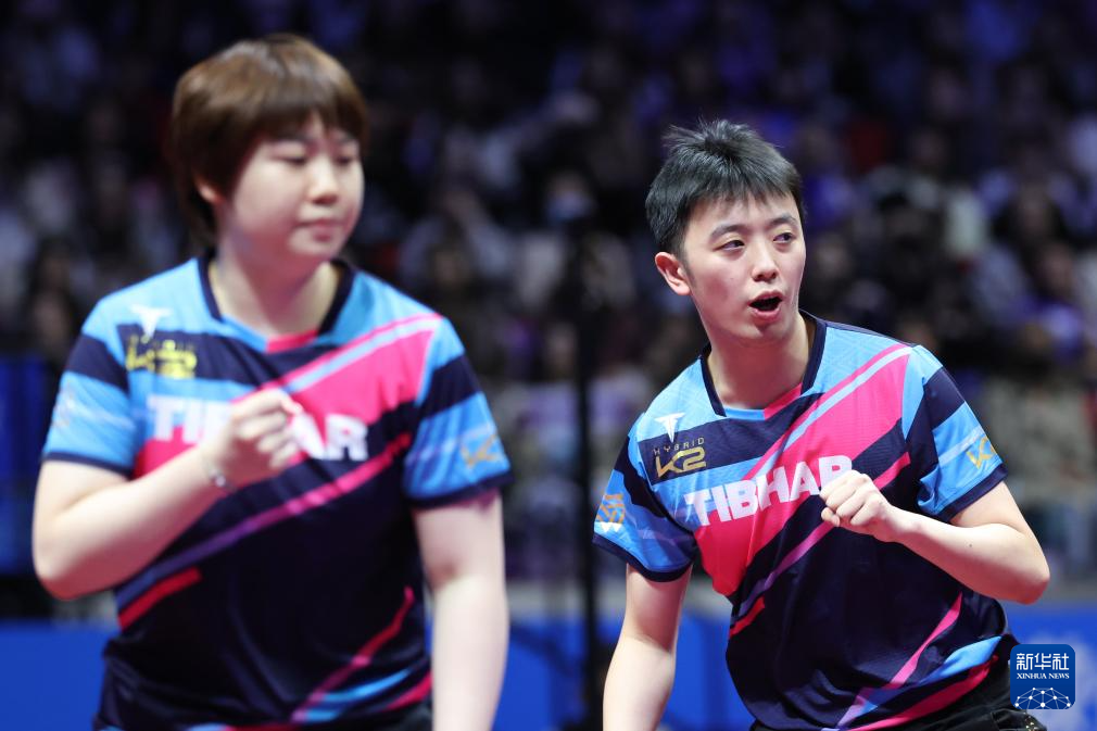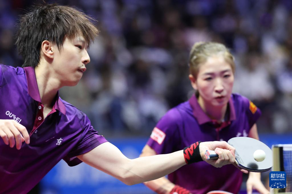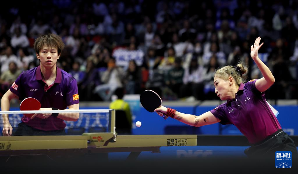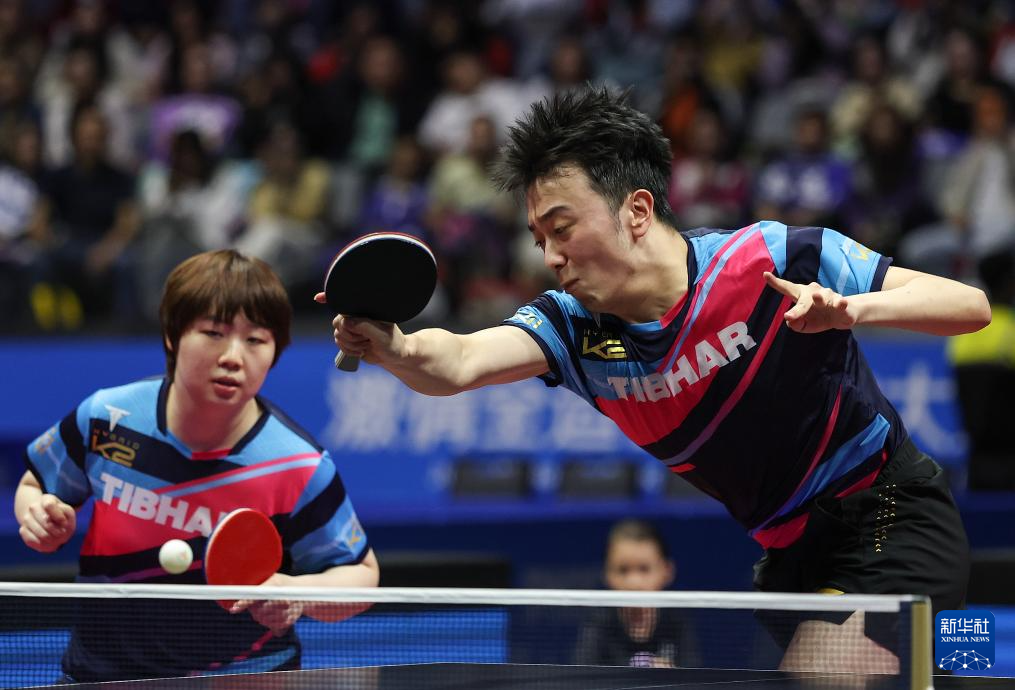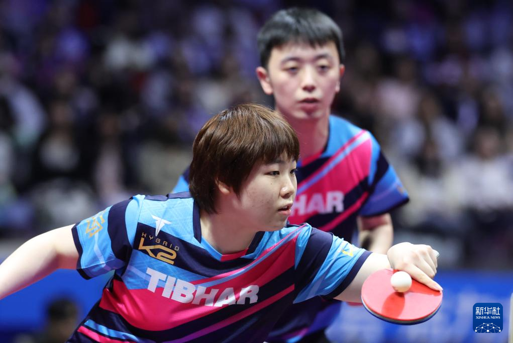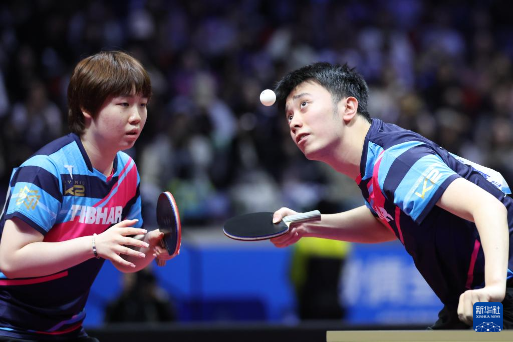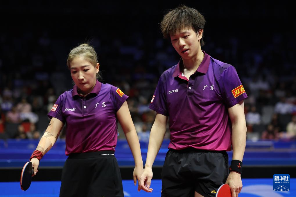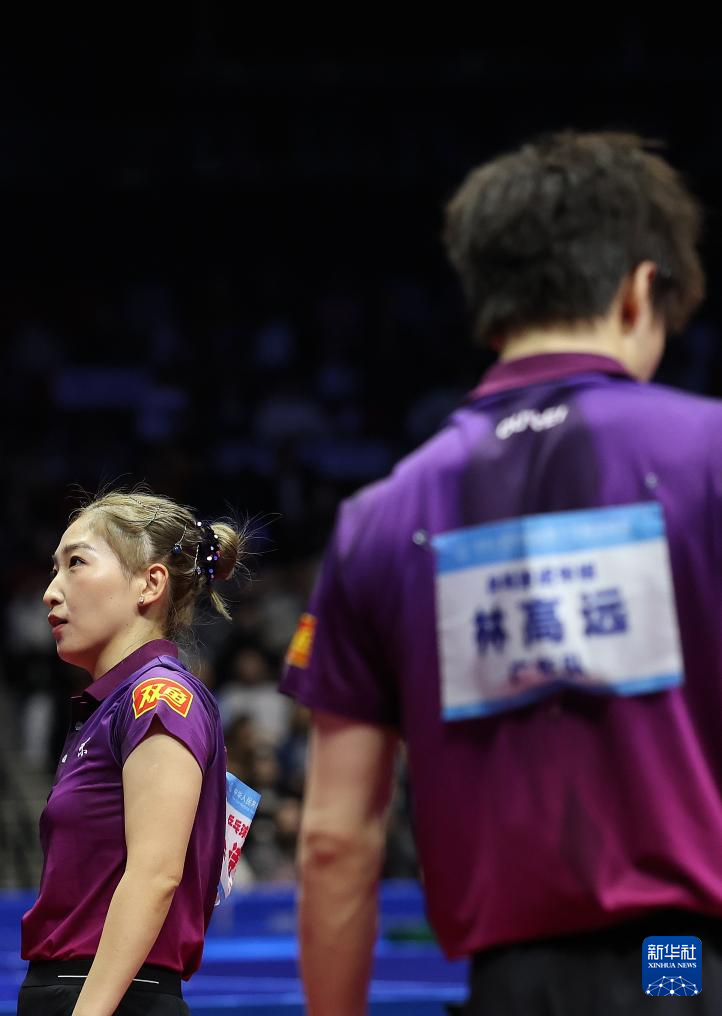 11月14日,广东队组合林高远/刘诗雯(右)在比赛中回球。