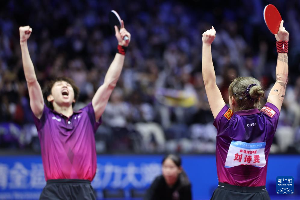 11月14日,广东队组合林高远(左)/刘诗雯庆祝夺冠。