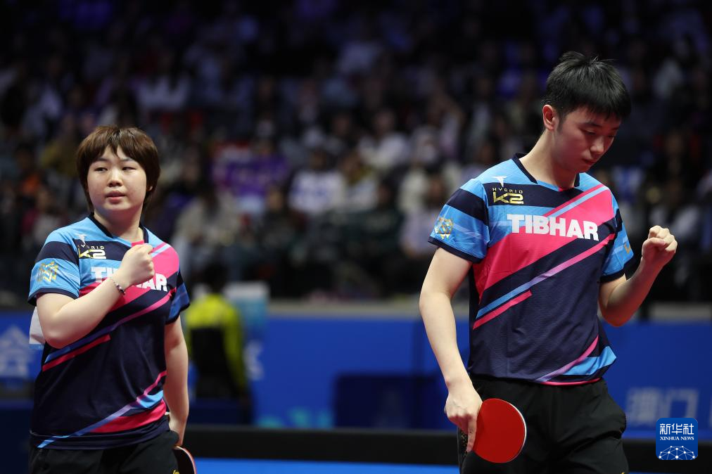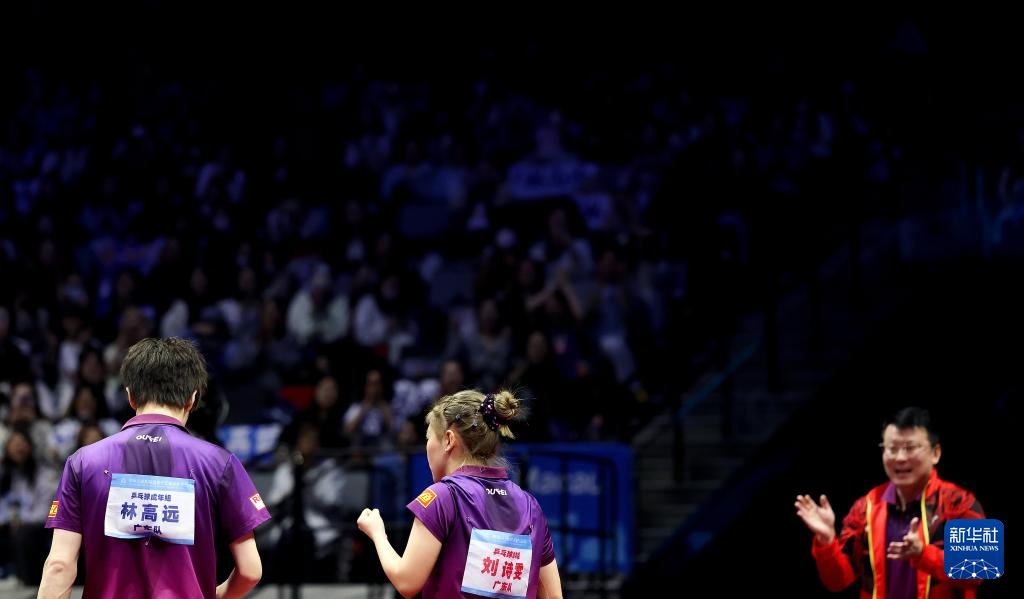 11月14日,广东队组合林高远/刘诗雯(左)在比赛中庆祝得分。