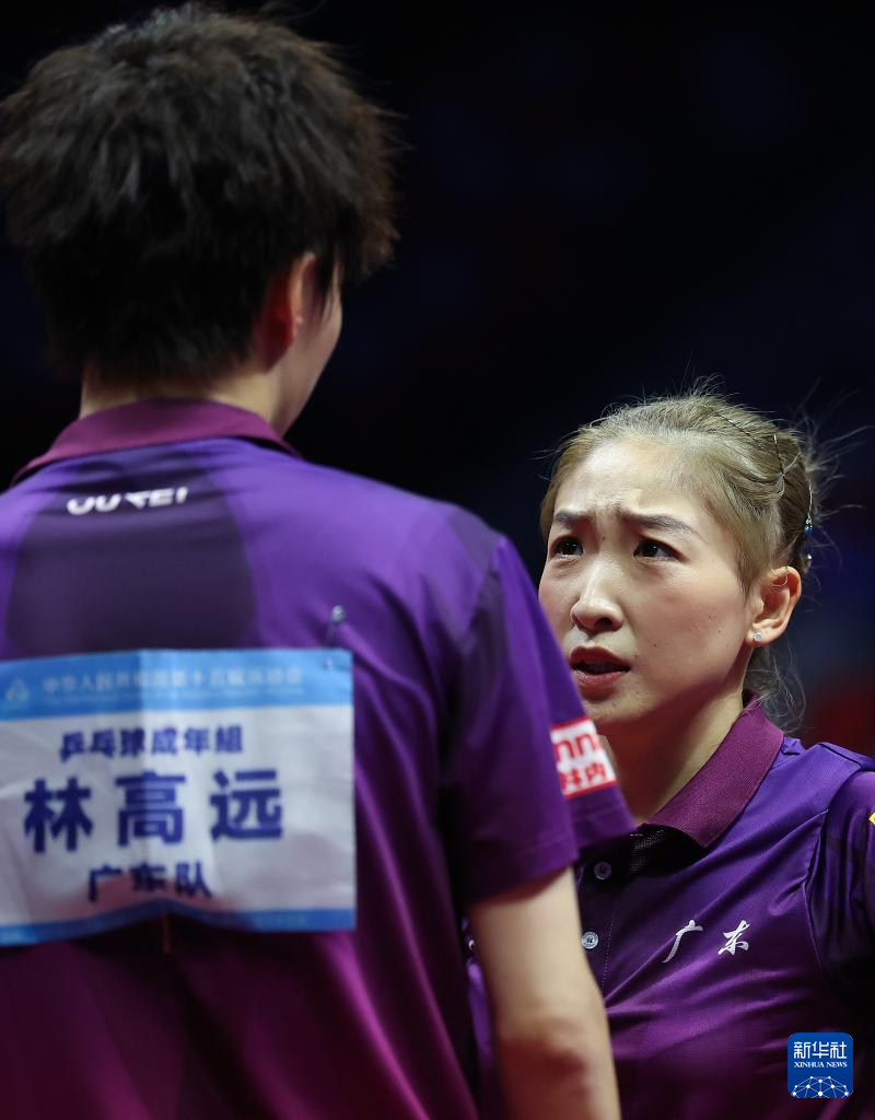 11月14日,广东队组合林高远(右)/刘诗雯在比赛中交流。