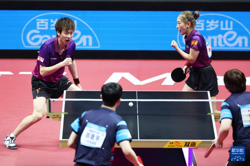 11月14日,广东队组合林高远/刘诗雯(右)和江苏队组合陈垣宇/蒯曼在比赛中。