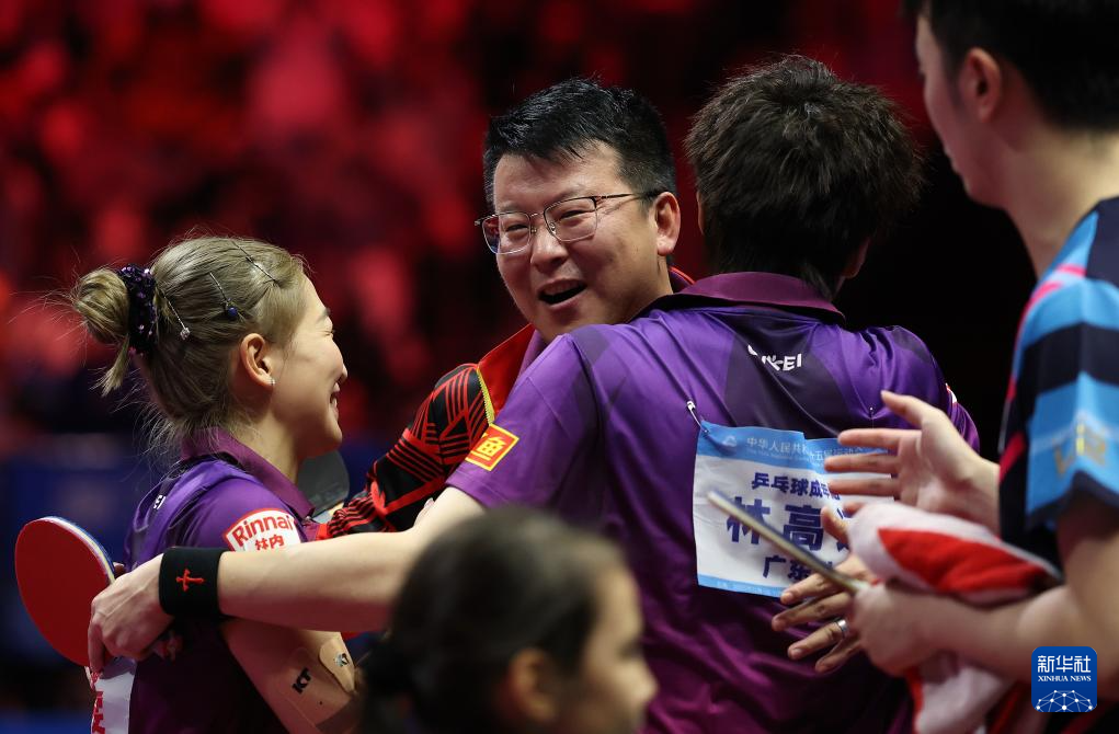 11月14日,广东队组合林高远(右)/刘诗雯(中)与教练张超在比赛后庆祝夺冠。