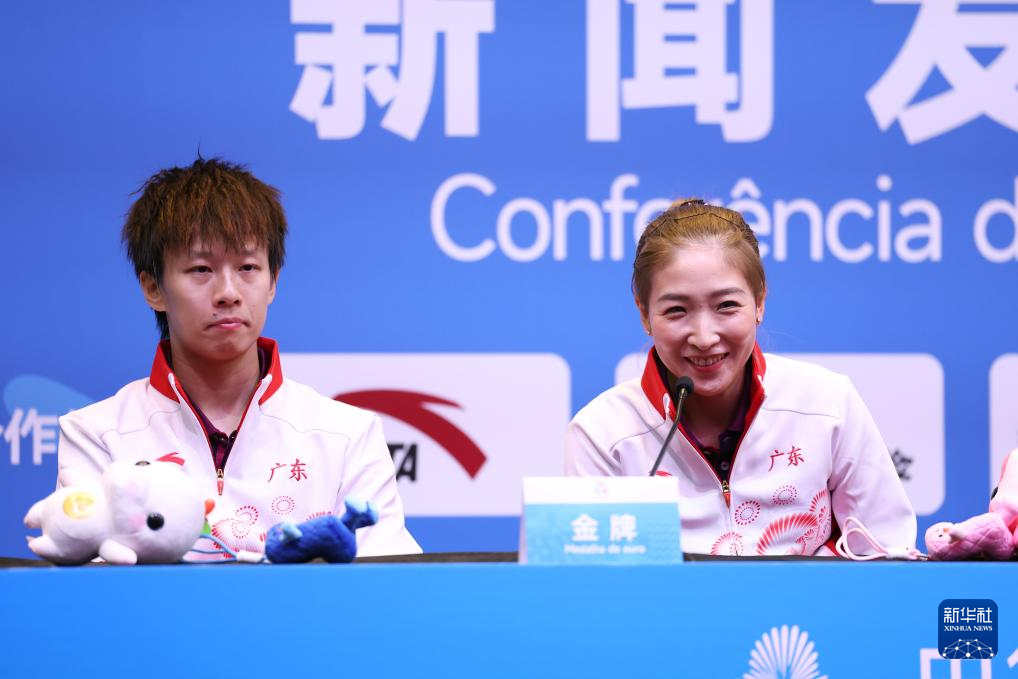 11月15日,获得冠军的广东队组合林高远(左)/刘诗雯在赛后新闻发布会上接受采访。