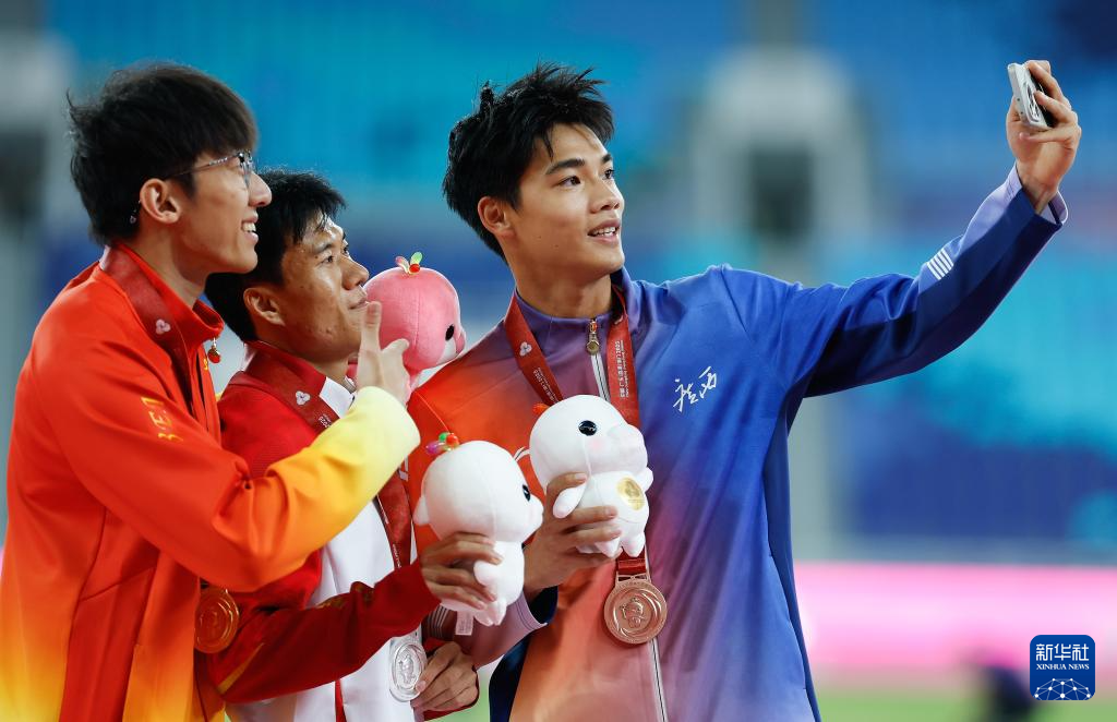 11月17日,冠军湖北队选手李泽洋(左)、亚军山东队选手王胜杰(中)、季军广西队选手曾克理在颁奖仪式上合影。