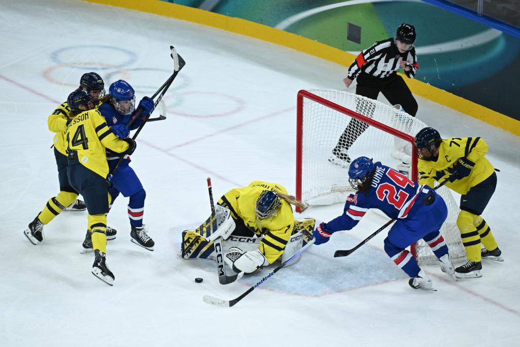 美国队的对手是瑞典队。本场开赛前,双方在本届冬奥会上均未尝败绩。开场后美国队占据优势,比赛进行到5分09秒,她们的围攻收获成效,后卫巴恩斯接队友传球轰出一记远射打破僵局。次节开始后,瑞典队获得两次多打少的机会,但均未把握住。美国队则展现出了在进攻端的强劲实力,单节打入四球,把领先优势扩大为5:0。
