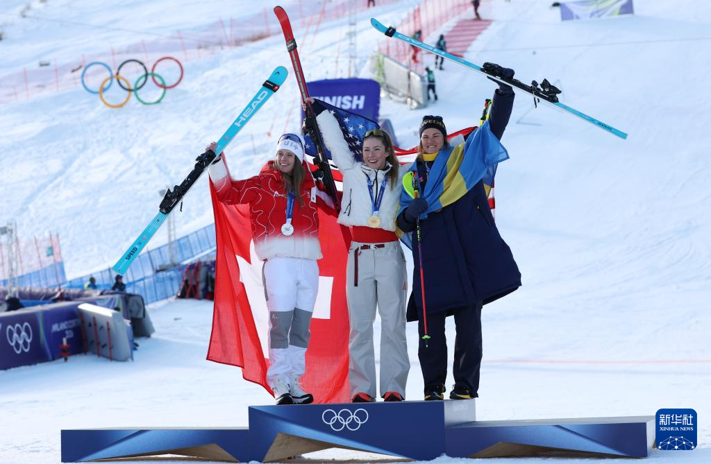 2月18日,冠军美国选手希夫林(中)、亚军瑞士选手拉斯特(左)和季军瑞典选手斯文·拉尔松在颁奖仪式上合影。