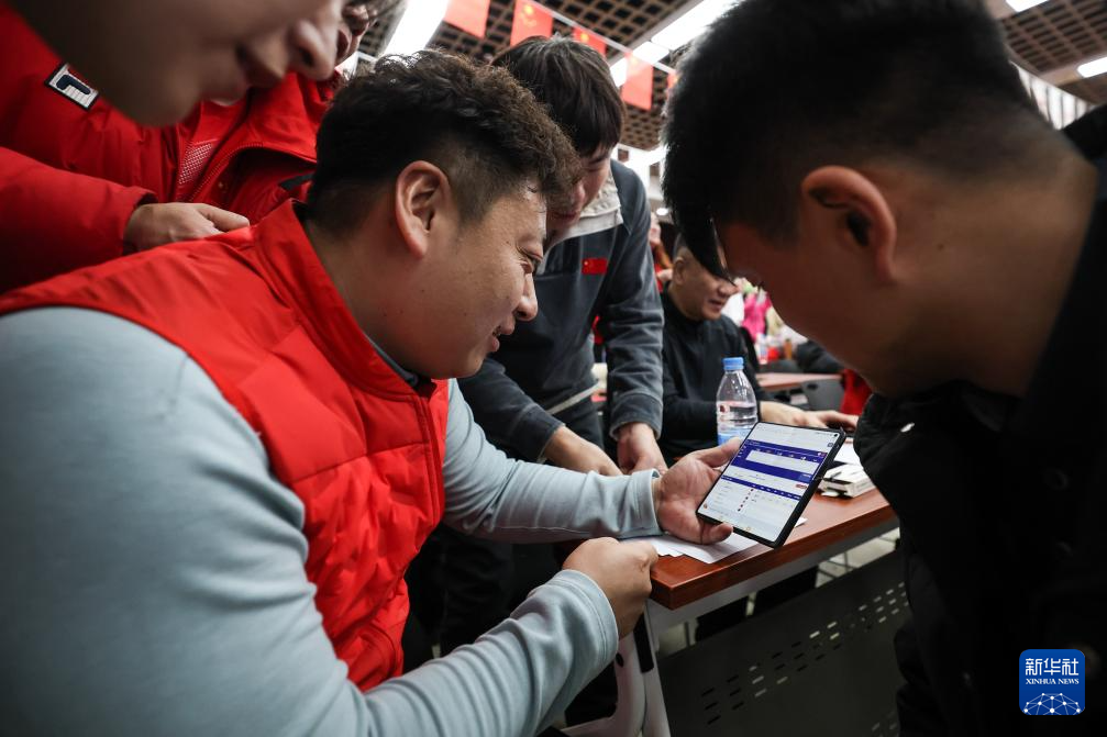 2月18日,沈阳体育学院的教师在关注比赛成绩。