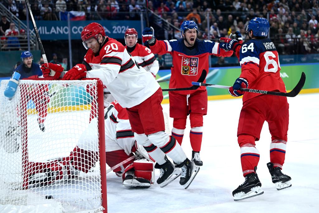 2月17日,捷克队球员坎普夫(右)和队友在比赛中庆祝得分。新华社记者 张豪夫 摄