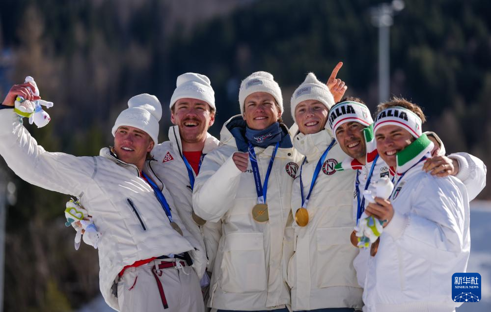 2月18日,冠军挪威队(中)、亚军美国队(左)和季军意大利队在颁奖仪式合影。