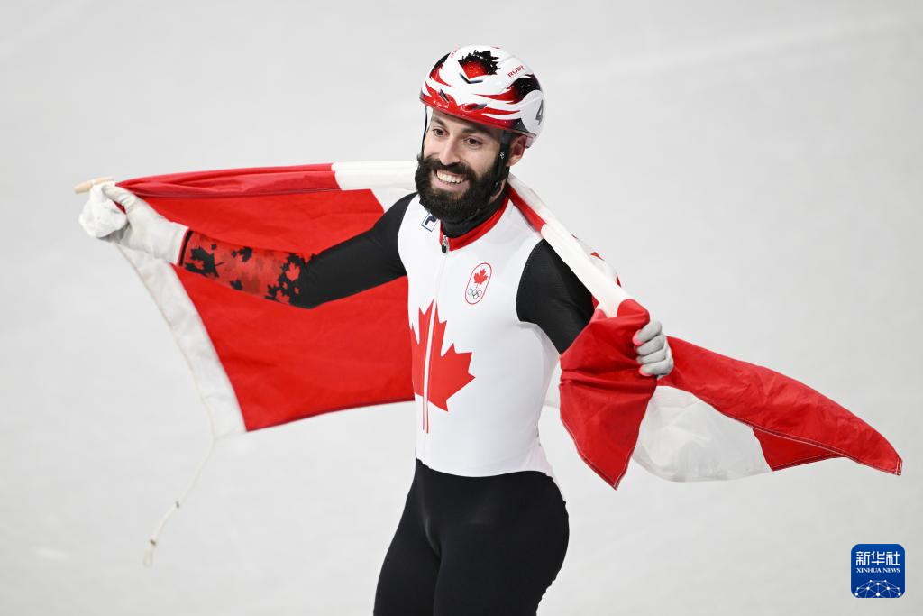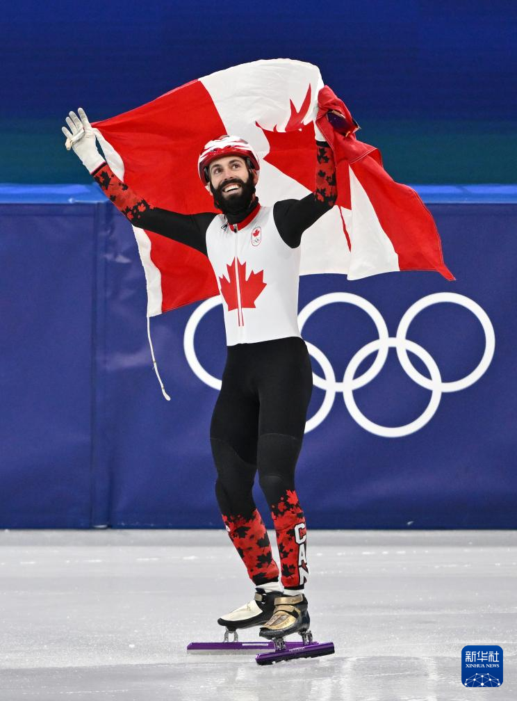2月18日,加拿大队选手史蒂文·杜博伊斯(右)在比赛中率先冲线后庆祝。