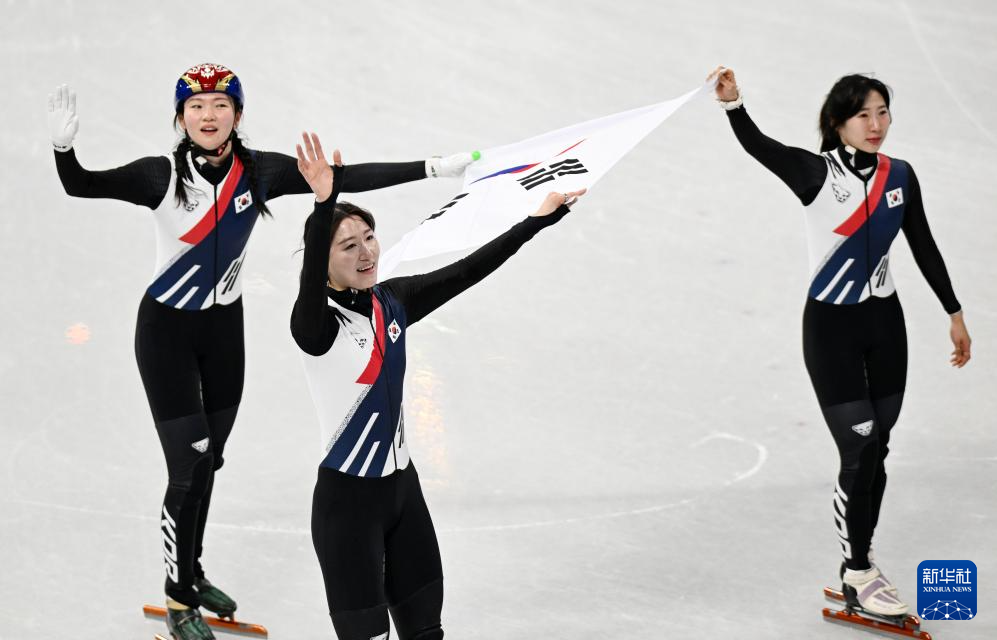 2月18日,韩国队选手金吉莉(右一)和崔敏静(左一)在比赛中接力。