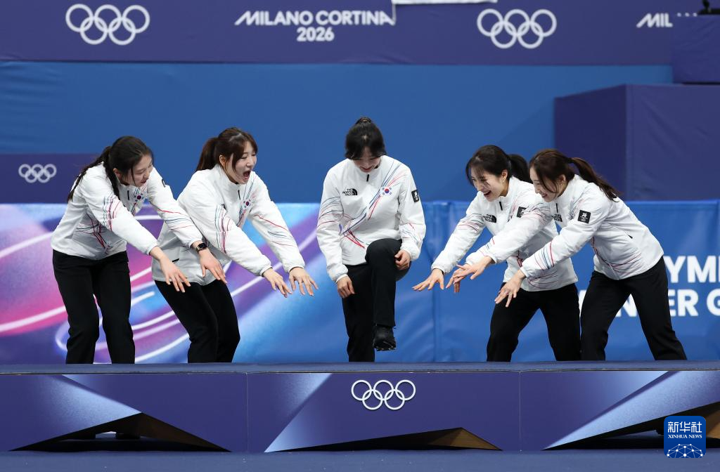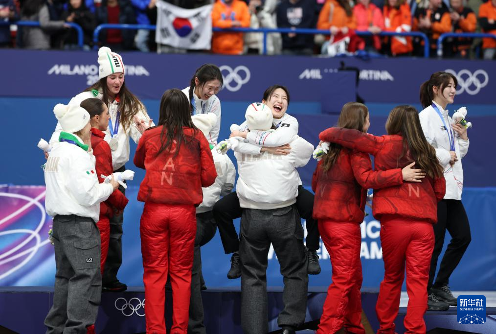 2月18日,冠军韩国队(上)、亚军意大利队(左下)和季军加拿大队在颁奖仪式上。