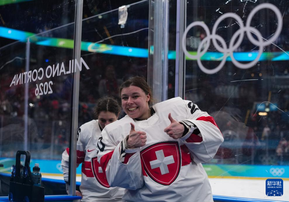 2月19日,瑞士队球员在比赛中庆祝得分。