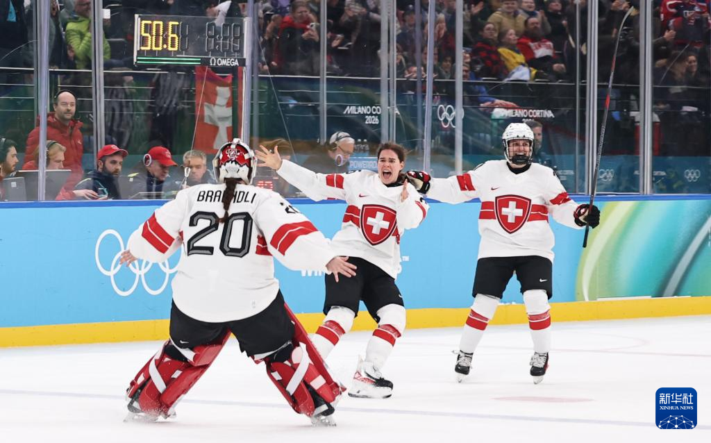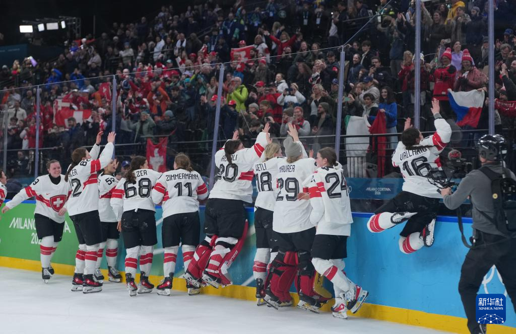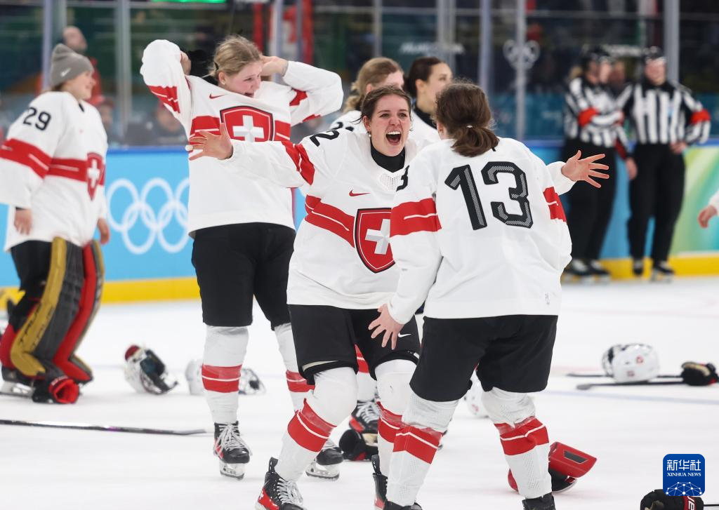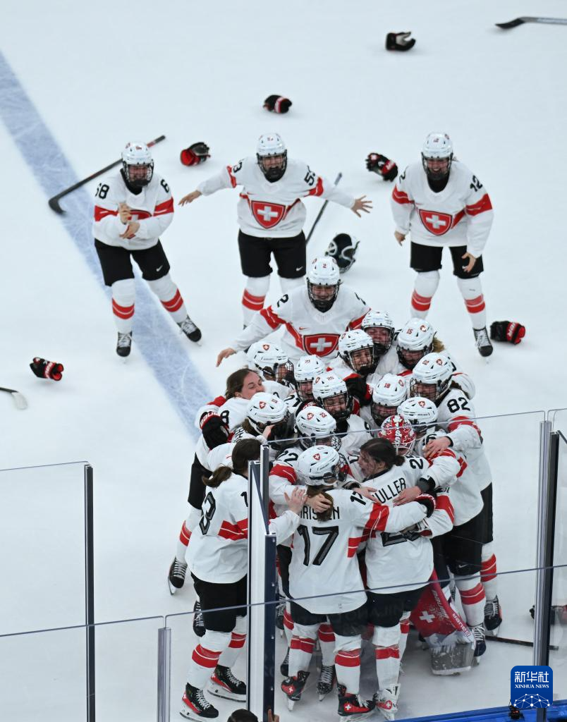 2月19日,瑞士队球员阿林娜·米勒(中)在加时赛中攻入制胜球后庆祝。