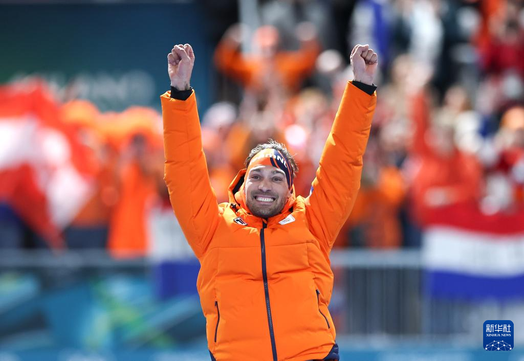 2月19日,荷兰选手凯尔·内斯在比赛后庆祝。他获得季军。