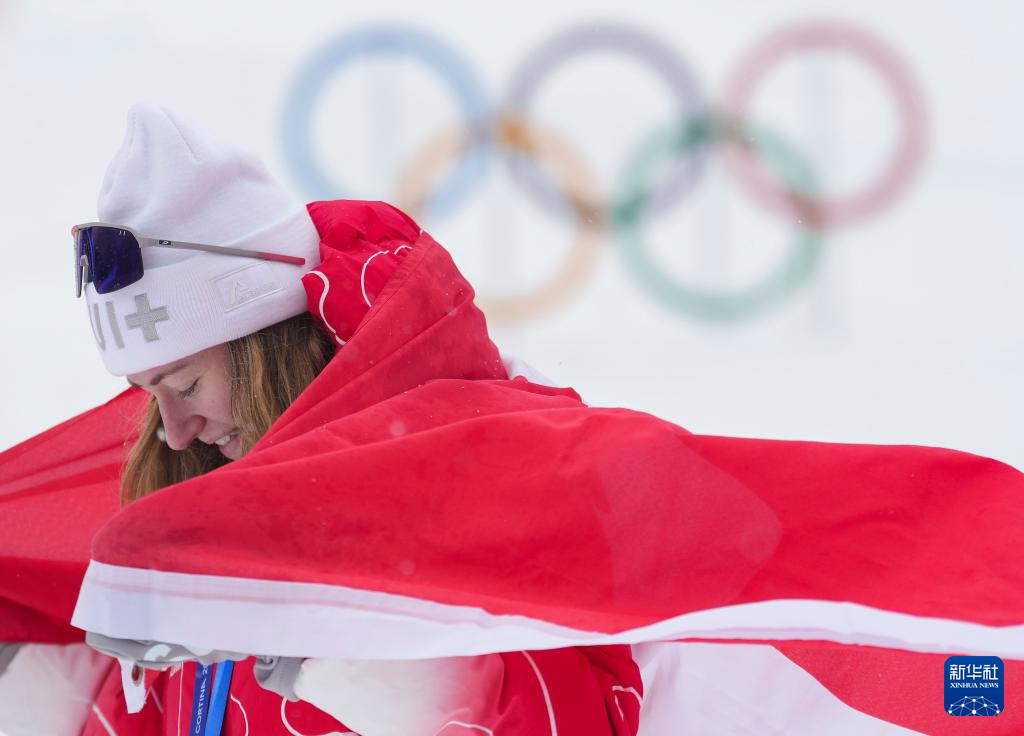 2月19日,瑞士选手法东在比赛后庆祝。她获得冠军。