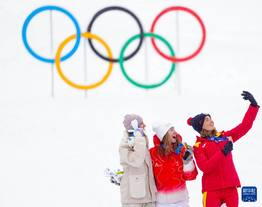 2月19日,冠军瑞士选手法东(中)、亚军法国选手哈罗普(左)和季军西班牙选手阿隆索·罗德里格斯在颁奖仪式上合影。