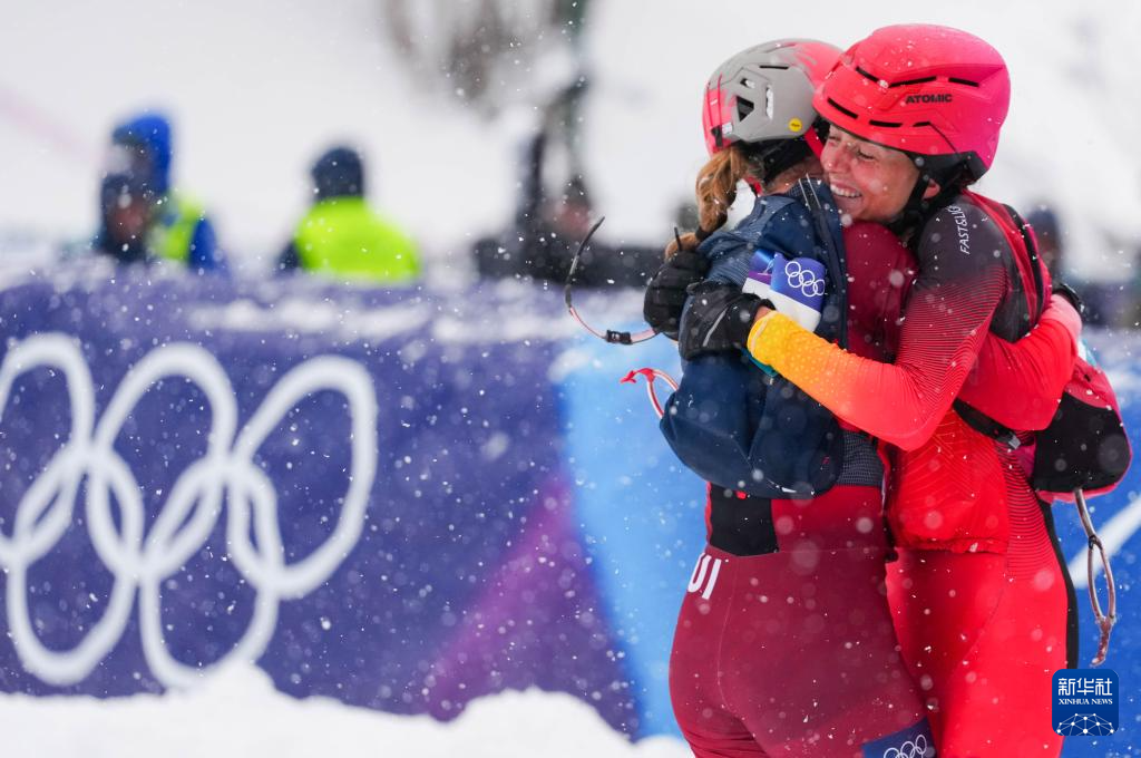 2月19日,瑞士选手法东(左)在比赛后与西班牙选手阿隆索·罗德里格斯拥抱。她们分别获得冠军和季军。