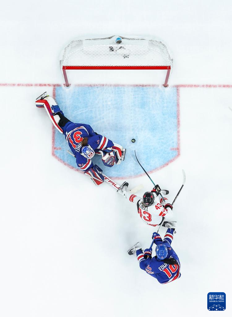 2月19日,美国队门将弗兰克尔(右三)在比赛中扑救。