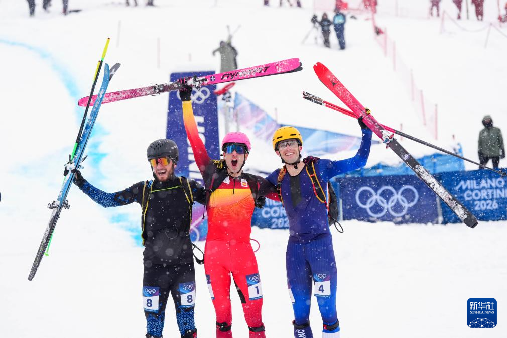 2月19日,冠军西班牙选手卡多纳·科利(中)、亚军中立运动员菲利波夫(左)和季军法国选手安塞尔梅在比赛后庆祝。